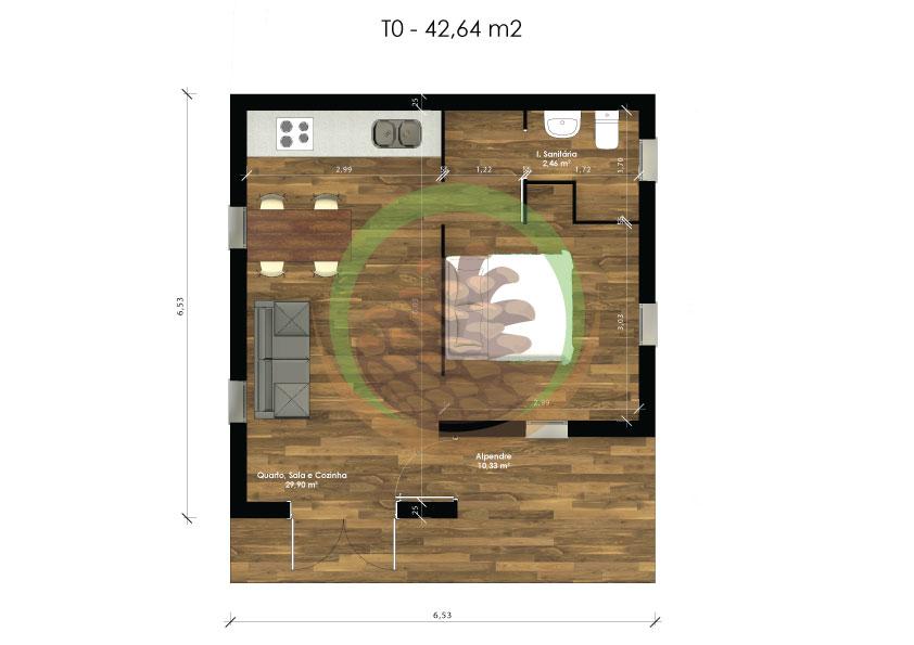 Esta encantadora casa de madeira T0 com 42 m² é a solução ideal para quem procura um espaço funcional, acolhedor e eficiente. Com um design compacto e inteligente, integra numa só divisão a zona de estar e dormir, além de uma casa de banho totalmente equipada e um pequeno alpendre coberto à entrada, perfeito para relaxar ao ar livre.
